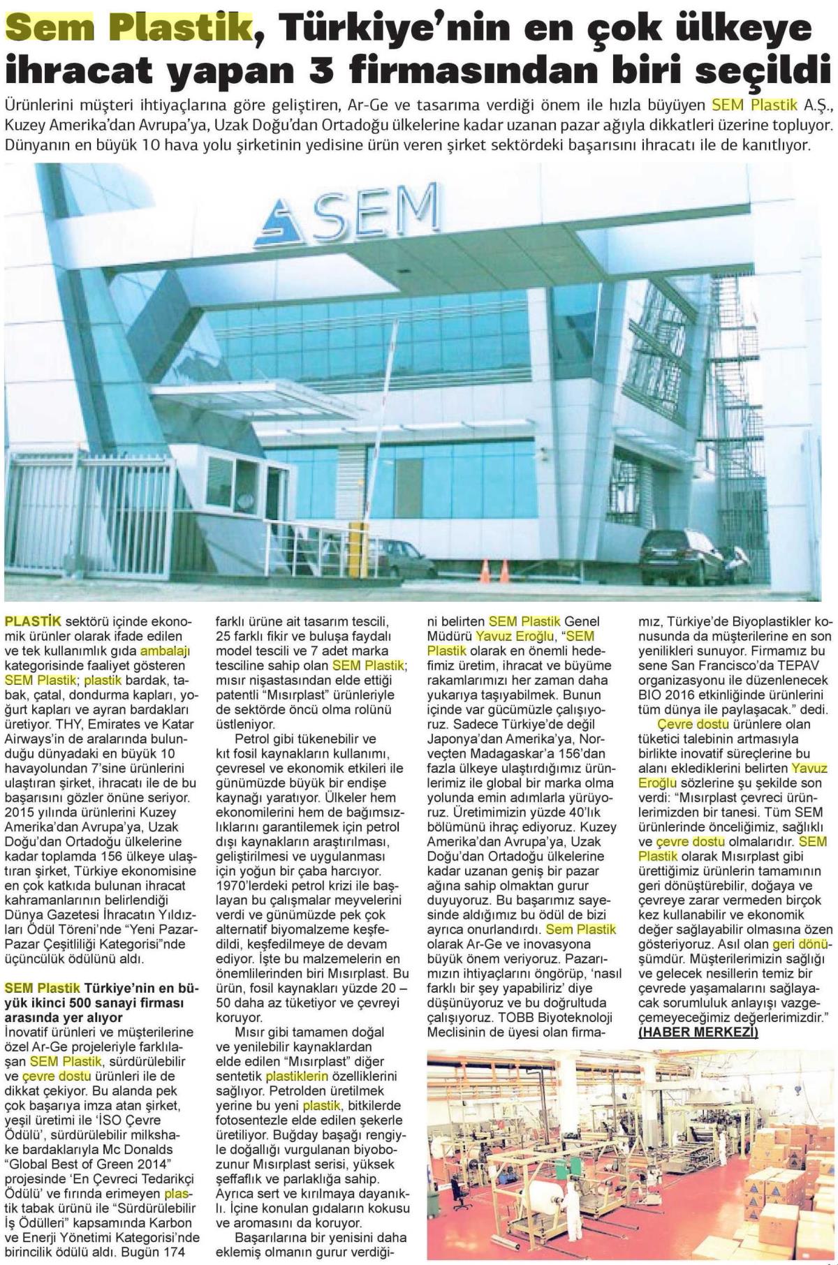 Plastik sektörü içinde ekonomik ürünler olarak ifade edilen ve tek kullanımlık gıda ambalajı kategorisinde faaliyet gösteren SEM Plastik; plastik bardak, tabak, çatal, dondurma kapları, yoğurt kapları ve ayran bardakları üretiyor. THY, Emirates ve Katar Airways’inde aralarında bulunduğu dünyadaki en büyük 10 havayolundan 7’sine ürünlerini ulaştıran şirket, ihracatı ile de bu başarısını gözler önüne seriyor. 2015 yılında ürünlerini Kuzey Amerika’dan Avrupa’ya, Uzak Doğu’dan Ortadoğu ülkelerine kadar toplamda 156 ülkeye ulaştıran şirket, Türkiye ekonomisine en çok katkıda bulunan ihracat kahramanlarının belirlendiği Dünya Gazetesi İhracatın Yıldızları Ödül Töreni’nde “Yeni Pazar-Pazar Çeşitliliği Kategorisi”nde üçüncülük ödülünü aldı.