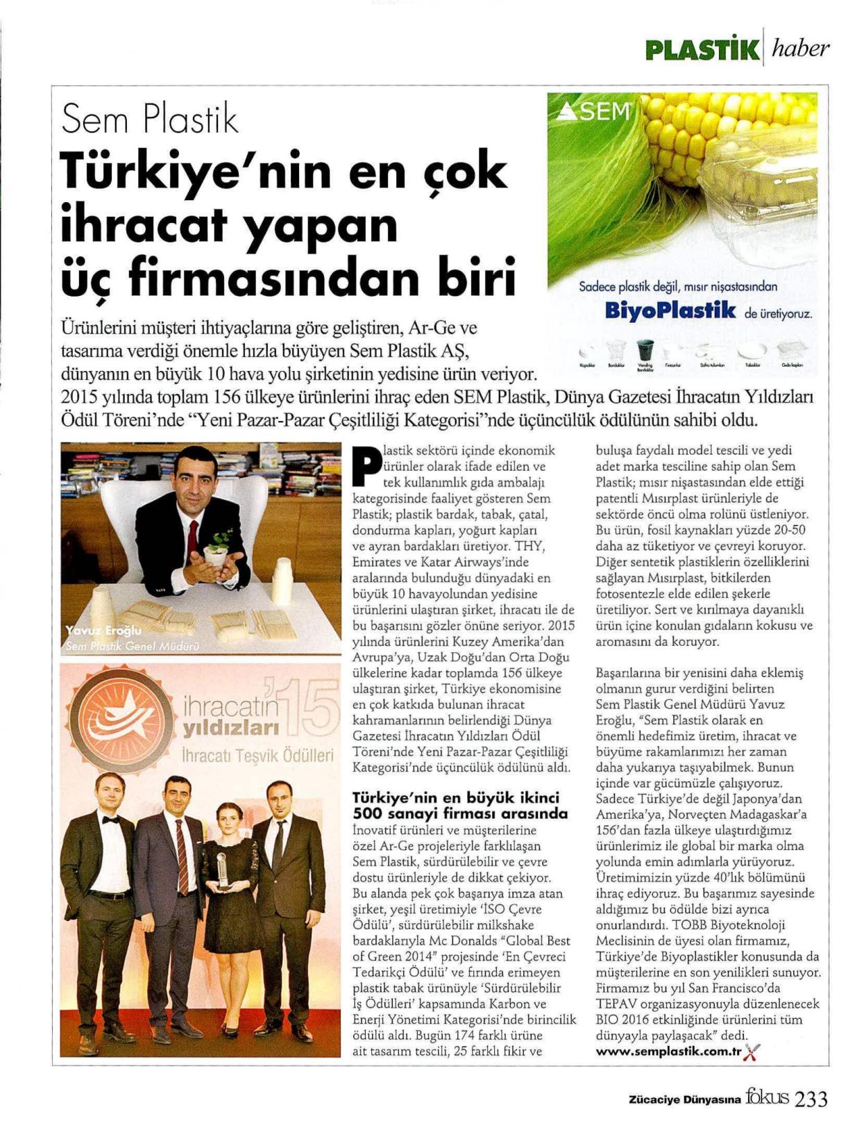 Ürünlerini müşteri ihtiyaçlarına göre geliştiren, Ar-Ge ve tasarıma verdiği önem ile hızla büyüyen SEM Plastik A.Ş., Kuzey Amerika’dan Avrupa’ya, Uzak Doğu’dan Ortadoğu ülkelerine kadar uzanan pazar ağıyla dikkatleri üzerine topluyor. Dünyanın en büyük 10 hava yolu şirketinin yedisine ürün veren şirket sektördeki başarısını ihracatı ile de kanıtlıyor. 2015 yılında toplam 156 ülkeye ürünlerini ihraç eden SEM Plastik, Dünya Gazetesi İhracatın Yıldızları Ödül Töreni’nde “Yeni Pazar-Pazar Çeşitliliği Kategorisi”nde üçüncülük ödülünün sahibi oldu. Tüm iş ve üretim süreçlerinde çevreci bir yaklaşım benimseyen SEM Plastik, Ar-Ge ve tasarım çalışmaları ile piyasaya sunduğu tamamen doğal kaynaklardan elde edilen patentli “Mısırplast” ürünleriyle özellikle Kuzey Amerika’nın ilgi odağında...