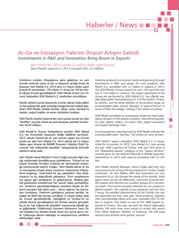 Sem Plastik Genel Müdürü Yavuz Eroğlu konuyla ilgili yaptığı açıklamada öncelikle grup şirketlerinin, Türkiye’nin en büyük ihracatçı firmaları arasında yer almasından duydu- ğu memnuniyeti belirtti. Eroğlu, “Sem Plastik olarak Ar-Ge ve inovasyona büyük önem veriyoruz. Pazarımızın ihtiyaç- larını öngörüp, ‘nasıl farklı bir şey yapabiliriz’ diye düşü- nüyoruz ve bu doğrultuda çalışıyoruz. Ürün gruplarımızı her geçen gün yeniliyoruz ve geliştiriyoruz. Böylece global pazarlarda ürünlerimize her zaman talep yaratabiliyoruz. Üretimini gerçekleştirdiğimiz ürünlerin büyük bir bö- lümü kuruştan bile daha ucuz… Buna rağmen hiç durmadan üretiyoruz. Üretimini yaptığımız yanmaz bardak, tabaklar da dâhil söz konusu ürünlerle 22 milyon doları aşan bir ihracat gerçekleştirdik. Geçtiğimiz yıl Türkiye’nin en yüksek ihracat gerçekleştiren bin firması arasına girmiştik. Bu yıl da ‘tek kullanımlık plastikler’ konusunda liderlik ipini göğüsledik. Ödülümüzü Ekonomi Bakanımız Sayın Nihat Zeybekci’nin elinden almak bizim için ayrıca gurur verdi. Çalışmaya devam edeceğiz ve başarılarımıza yenilerini ekleyeceğiz” dedi.