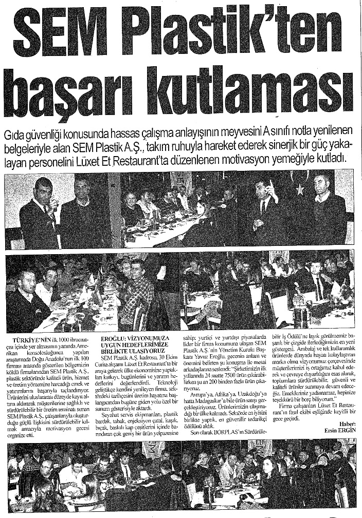 Seyahat servis ekipmanları, plastik bardak, tabak, enjeksiyon çatal, kaşık, bıçak, baskılı kap çeşitlerini içinde barındıran çok geniş bir ürün yelpazesine sahip; yurtiçi ve yurtdışı piyasalarda lider bir firma konumuna ulaşan SEM Plastik A.Ş.’nin Yönetim Kurulu Başkanı Yavuz Eroğlu, gecenin anlam ve önemini belirten şu konuşma ile mesai arkadaşlarına seslendi: "Şirketimizin ilk yıllarında 24 saatte 7500 ürün çıkarabilirken şu an 200 binden fazla ürün çıkarıyoruz.