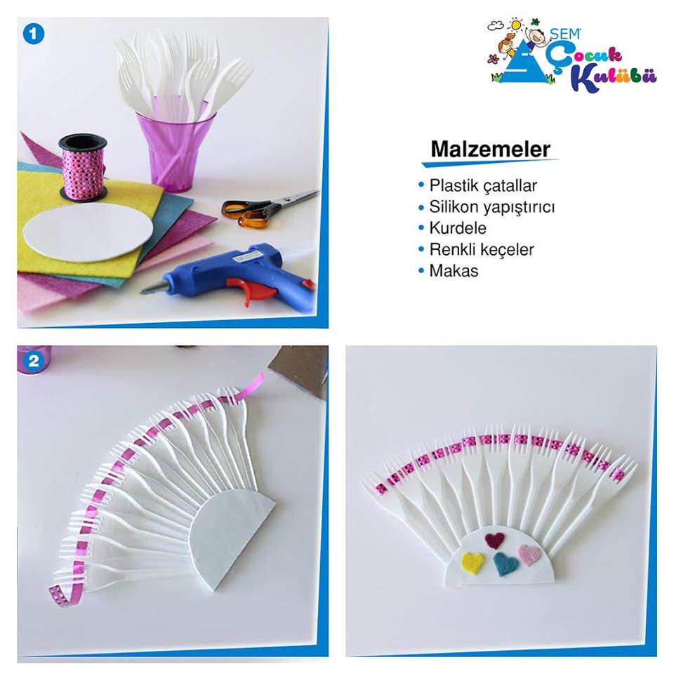 Havalar ısındı. Kullanıılmış plastik çatal ve tabaklarımızı atmıyoruz. bunlarla en güzel yelpazeyi yapıp, süslüyoruz. önce biz serinliyoruz sonra yaptığımız diğer yelpazeleri sevdiklerimize hediye ediyoruz...